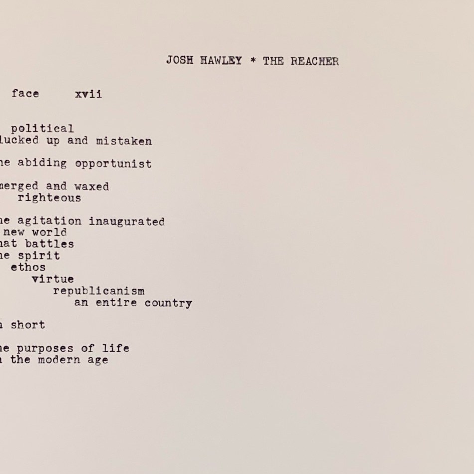 One goal of this project is to create a series of art objects that keeps Hawley’s malpractice of leadership in the public eye. Another–down the road–is to auction off the individual leaves (2 pages per leaf + typewriter-printed versions of the poems) with all proceeds going to organizations that are working to remove Hawley from office or defeat him when his term comes up. These are Democratic and Republican organizations. The house, our house–the capitol–is on fire; I don’t care whose hose puts it out.